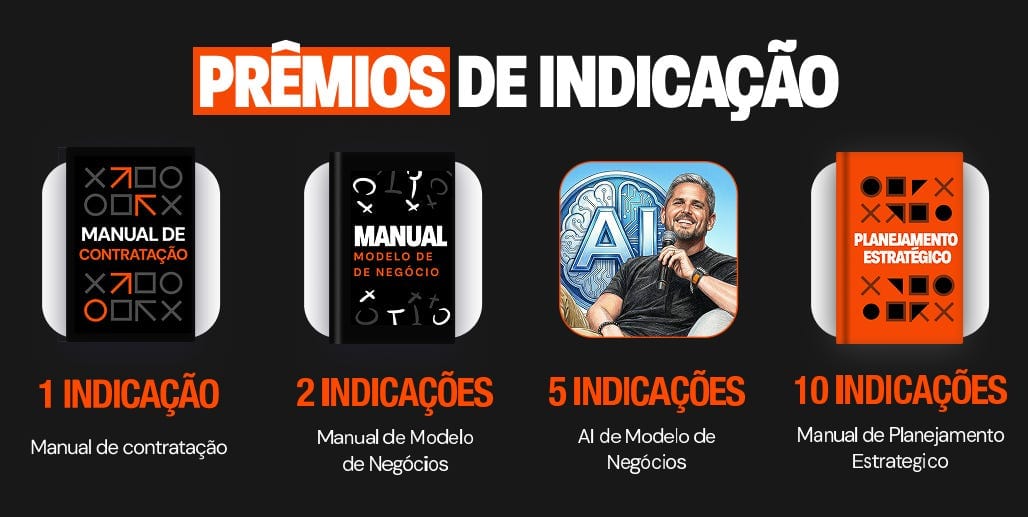 Com 1 indicação você leva o Manual de Contratação. Com 2, o Manual de Modelo de Negócios. Com 5, o curso de AI de Modelo de Negócios. Com 10 indicações, o Manual de Planejamento Estratégico vai direto pra sua mão.